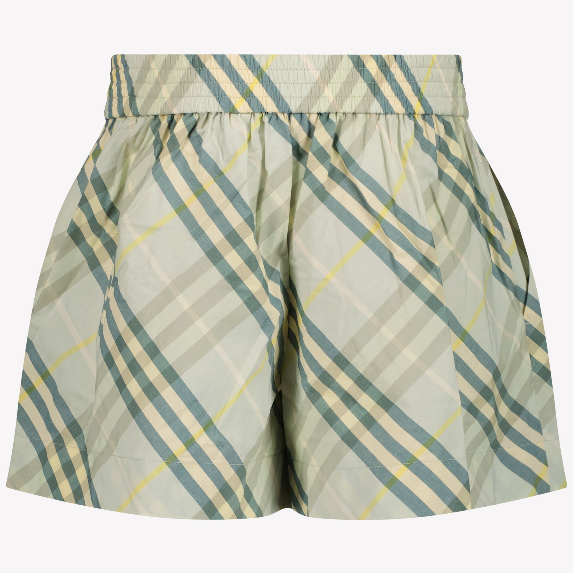 Entdecken Sie den raffinierten Charme dieser hellgrünen, karierten Baumwollshorts von Burberry. Mit einem subtilen elastischen Bund und zwei praktischen Seitentaschen verbinden Sie mühelos Stil mit Komfort für Ihren Kleinen. Der legendäre karierte Druck ausstrahlt zeitlose Eleganz, perfekt für sonnige Tage. 🌿