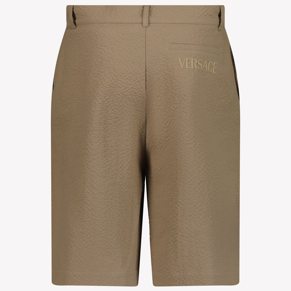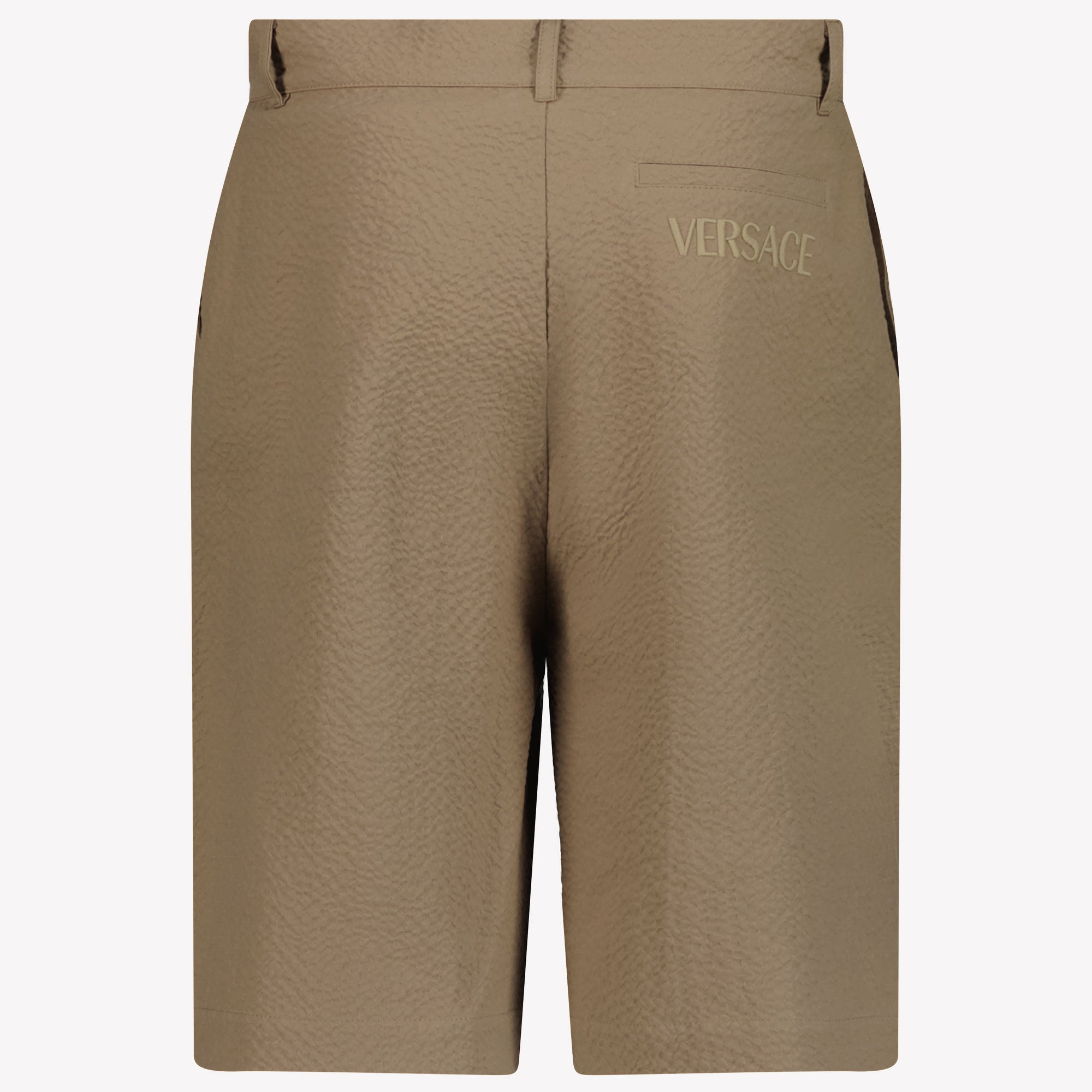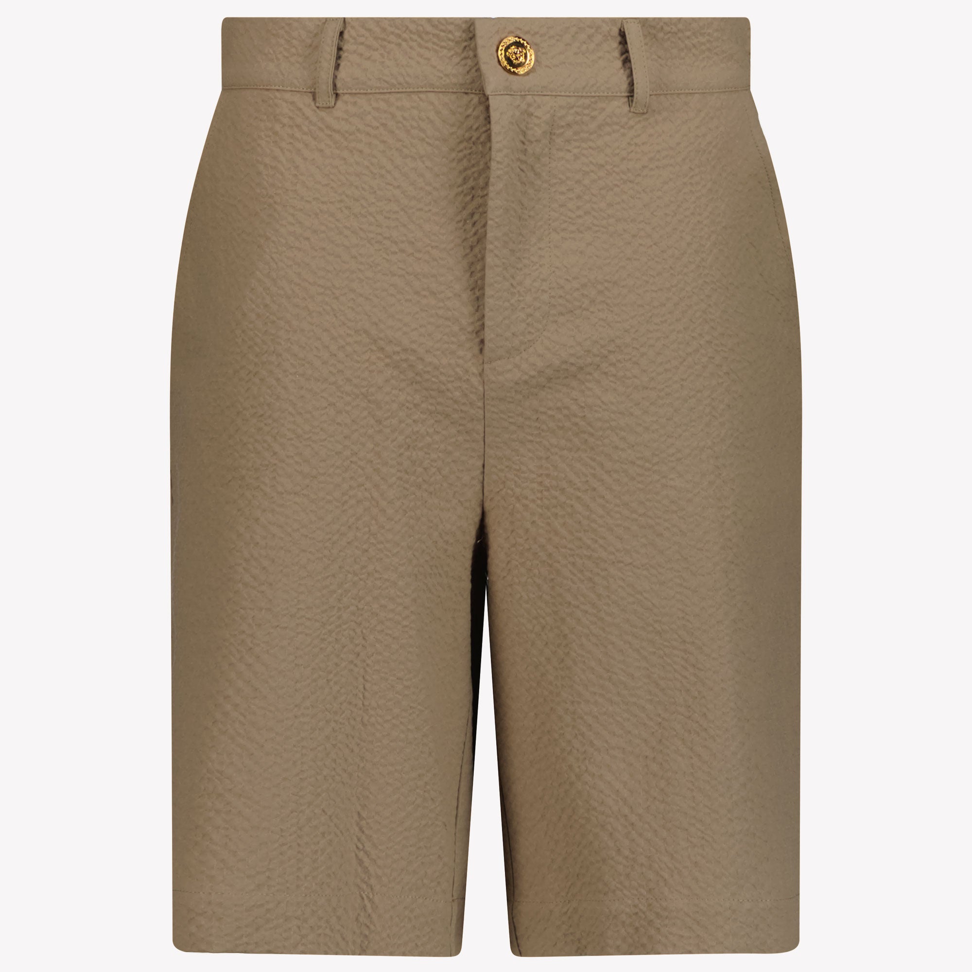 Discover the sophistication of these seersucker shorts in light brown, specially designed for the young trendsetter. The concealed fly and button closure provide an elegant finish, while the side and welt pockets add practical luxury. The iconic Medusa main motif from Versace exudes exclusivity. These shorts effortlessly combine style and comfort, ideal for sunny days. 🌞